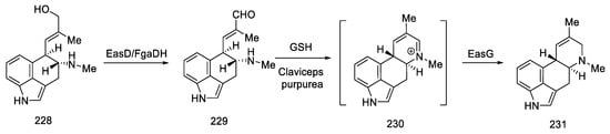 - Matuschek, M.; Wallwey, C.; Xie, X.; Li, S.-M. New Insights into Ergot Alkaloid Biosynthesis in Claviceps Purpurea: An Agroclavine Synthase EasG Catalyses, via a Non-Enzymatic Adduct with Reduced Glutathione, the Conversion of Chanoclavine-I Aldehyde to Agroclavine. Org. Biomol. Chem. 2011, 9, 4328–4335. [Google Scholar] [CrossRef] [PubMed]