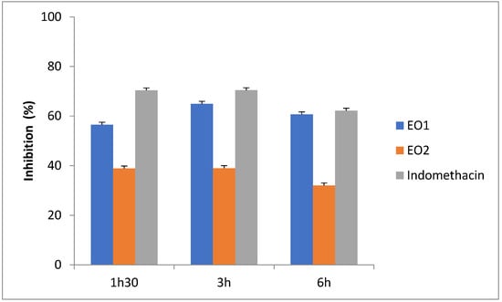 The in vivo anti-inflammatory effect was carried out using a rat model of carrageenan-induced paw edema [68]. Briefly, Wistar rats (160 to 190 g) were fasted for 18 h and then randomly divided into four groups containing six animals. The first two groups received orally a dose of 100 mg/kg of EO of O. compactum, respectively. The 3rd group was a negative control who received distilled water, while the last group was considered a positive control and received indomethacin (10 mg/kg) as the reference anti-inflammatory drug. After 60 min, all rats were injected subcutaneously with carrageenan solution (0.05 mL of 1% carrageenan suspended in 0.9% NaCl) into the sub plantar region of the left hind paw. The volume changes of both legs for each rat are measured using a plethysmometer (LE 7500 Digital) at 30 min after the initiation of inflammation and then at 1 h 30, 3 h, 4 h, 5 h, and 6 h 00 after edema induction [69]. Anti-inflammatory activity is assessed by calculating the percentage of edema inhibition (% INH) in paw volume, as follows: