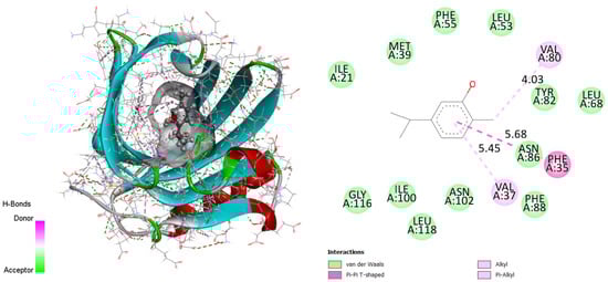Two-dimensional and three-dimensional docking poses proving carvacrol interactions in the binding site (binding energy 7.04 kcal/mol). This figure was made with Discovery Studio 3.5.