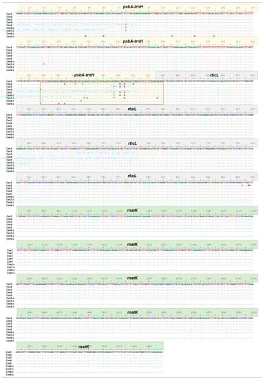 - CBOL Plant Working Group 1; Hollingsworth, P.M.; Forrest, L.L.; Spouge, J.L.; Hajibabaei, M.; Ratnasingham, S.; van der Bank, M.; Chase, M.W.; Cowan, R.S.; Little, D.P.; et al. A DNA barcode for land plants. Proc. Natl. Acad. Sci. USA 2009, 106, 12794–12797. [Google Scholar] [CrossRef]