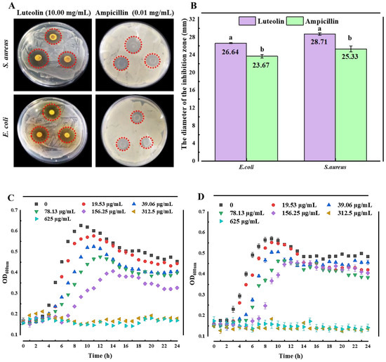 Antibacterial effects of LUT against E. coli and S. aureus. (A) Photos of the diameter of the inhibition zone of 10.00 mg/mL LUT and 0.01 mg/mL ampicillin for E. coli and S. aureus, respectively. (B) The diameter of the inhibition zone by 10.00 mg/mL LUT and 0.01 mg/mL ampicillin. Growth curves for (C) E. coli and (D) S. aureus treated with different concentrations of LUT. Different letters (a~b) mean that significant differences were observed (p < 0.05). The bars represent the standard deviation (n = 3).