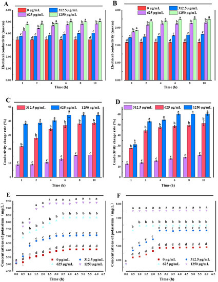 Electrical conductivity of E. coli (A) and S. aureus (B) treated with different concentrations of LUT. Changes in the conductivity rate for E. coli (C) and S. aureus (D) treated with different concentrations of LUT. The K+ effluxes of E. coli (E) and S. aureus (F) treated with different concentrations of LUT. Different letters (a~d) indicated significant differences between different concentrations (p < 0.05). Error bars indicate the standard deviation of three technical replicates (n = 3).
