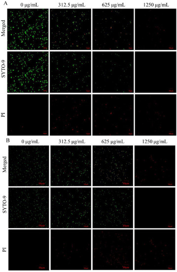 Confocal laser scanning microscopy images of E. coli (A) and S. aureus (B) treated with LUT at 0, 312.5, 625, and 1250 μg/mL for 10 h. The dead bacteria were visualized by PI staining (red fluorescence), while SYTO 9 was used to identify all bacteria (green fluorescence). When PI and SYTO 9 dye (merged) were added to the system, the insertion of PI decreases the fluorescence of SYTO 9 staining. Bacteria with intact membrane structures (green fluorescence); bacteria with damaged membrane structures (red fluorescence). The scare bar represents 10 µm.