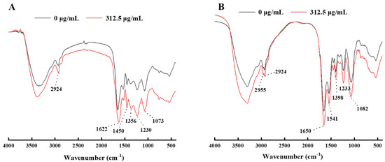 FTIR spectra of (A) E. coli and (B) S. aureus upon LUT treatments at 0, 312.5 μg/mL. The scan range was 400~4000 cm−1 for 32 scans.