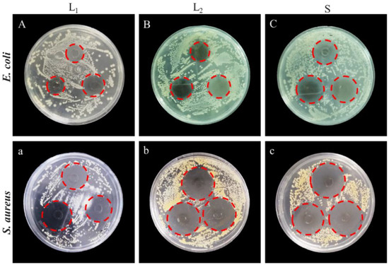 The diameter of the inhibition zone of LUT hand sanitizers compared to two commercially available hand sanitizers (L1 and L2) against E. coli and S. aureus. A–C: the diameters of inhibition zones of L1, L2 and S against E. coli; a–c: the diameters of inhibition zones of L1, L2 and S against S. aureus. Note: L1, the commercially available antibacterial hand sanitizer; L2, the commercially available common hand sanitizer.