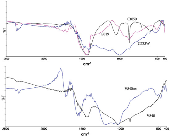 The nitrogen adsorption/desorption isotherms for all samples can be classified as type I according to IUPAC [13], not shown here for simplicity, which indicates ACs with a predominant porous structure composed of micropores. As shown in Table 1, where typical porosity parameters have been listed, all samples have low external area reaching a maximum of 71 m2g−1 for sample G742. Regarding the pristine activated carbon samples, we can see a reasonable porous development with BET apparent surface areas between 308 and 956 m2g−1 and total micropore volume from 0.15 to 0.44 cm3g−1. The values of burn-off attained were in all cases less than 50%wt, which is suitable for industrial production of ACs. Additionally, for a particular precursor, the increase in the temperature produces samples with a higher burn-off value and an enhanced porosity development (with the exception of G819). The modification with TEDA has led to a general increase of the external area and a decrease of the BET apparent surface area within the range of 39 to 165 m2g−1. The same trend can be observed for the micropore volume. The decrease in porosity can be associated with the formation of clusters that partially block the micropores [14,15,16]. The oxidation with nitric acid has caused a greater impact on the sample’s porosity, namely on the BET apparent surface area and micropore volume with a decrease of 310 m2g−1 and 0.15 cm3g−1, respectively. The similarity between Vs and V0 indicates that samples, in general, have pores in the range of primary micropores with a mean pore width of less than 0.7 nm.