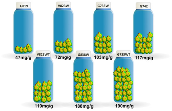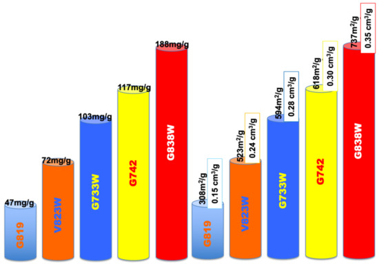On the other hand, it is clearly visible that the modification with TEDA lead to a significantly increased adsorption, despite the decrease in the porous structure. Sample V823WT reached a maximum adsorption capacity of 119 mg/g, which constitutes a 65% increase when compared with sample V823W. Regarding the pair G733WT-G733W, the increase was 85%. The BET apparent surface area decreased from 523 to 358 m2/g, for the first case, and from 594 to 555 m2/g for the sunflower samples.