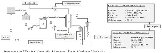 The experiments were conducted in a bench-scale reactor system that modelled the industrial furfural obtaining process. The reactor had an internal diameter of 110 mm and a volume of 13.7 dm3. The reactor was equipped with a steam jacket and a corresponding automatic control system to maintain constant temperature and pressure throughout the experiment [14] (Figure 1). The hydrolysis time (90 min) and the treatment temperature (175 °C) were constant, while the amount of the catalyst (2, 3 or 4% of oven-dried biomass) was varied. The pressure in the reaction medium was also constant at 7.9 ± 0.1 bar. The used catalysts were AlPO4, Ca3(PO4)2, FePO4, NaH2PO4 and H3PO4, as well as without a catalyst for an autohydrolysis process. To show the catalytic properties of the used chemicals, autocatalytic hydrolysis was performed as a reference process to better understand these salts’ catalytic effects.