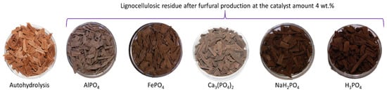 Four different phosphorus-containing salts (AlPO₄, Ca₃(PO₄)₂, FePO₄, NaH₂PO₄) at three different amounts (2, 3 and 4 wt.%, calculated relative to oven-dried mass (o.d.m.)) were used as catalysts during the hydrolysis process to produce furfural from the birch wood chips. Figure 2 demonstrates the visual differences in lignocellulosic residue colour after furfural production with different catalysts. Autocatalysis and H₃PO₄-catalysed hydrolysis were performed as reference processes to better understand these salts’ catalytic effects. The obtained results are summarised in Figure 2.