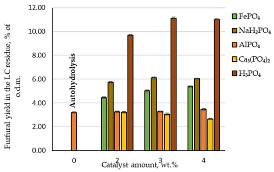 The yield of furfural produced under autohydrolysis conditions was only 20.7% of the t.p.y. or 3.2 wt.%, calculated relative to o.d.m. Compared with industrial yield in conventional furfural production plants (which does not exceed 55% of the t.p.y.), this yield is approximately 60% lower and the addition of a catalyst is necessary to improve furfural yield. Adding phosphoric acid as a catalyst at 2, 3 and 4 wt.% to the reaction medium, the obtained amount of furfural increased to 62.9, 72.3 and 71.7% of the t.p.y. or 9.7, 11.1 and 11.0% of the o.d.m., respectively (Figure 3). Analysing these experimental data, it can be seen that the highest furfural yield from the birch wood chips was produced at the catalyst amount of 3 wt.%. This allows us to conclude that there is no need to further increase the catalyst amount in the reaction medium. Comparing these results with a previous study [14] where sulfuric acid was used as a catalyst in the same pre-treatment procedure, a similar observation could be made. Unfortunately, the disadvantage is that using phosphoric acid as a catalyst requires a higher temperature to achieve the same reaction efficiency achieved with sulfuric acid at 160 °C [14]. It is also confirmed in other publications [17] that furfural can be produced using phosphoric acid as a catalyst in the temperature range 170–200 °C. On the other hand, when using a greener furfural production process (for example, high-pressure CO2 treatment), temperatures higher than 200 °C are needed. Furthermore, an additional step must be included in which hemicellulose is extracted from lignocellulosic biomass before furfural production using the previously mentioned method [18]. From the industrial point of view, this additional step is not desirable.
