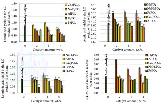When acting on biomass with physicochemical processes, in addition to the target product, by-products are also inevitably formed. In our process formic acid, acetic acid, levulinic acid and 5-HMF were detected as by-products. As can be seen in Figure 4, among these acetic acid was produced with the highest yield (3.5–5.3% of the o.d.m.). Comparing the produced amount of acetic acid during autohydrolysis with the amount produced in the presence of phosphorous-containing salts, it can be concluded that AlPO₄, Ca₃(PO₄)₂ and FePO₄ did not have a catalytic effect on the deacetylation reaction of the acetyl groups. The produced yields of acetic acid were very similar to the yield obtained via autohydrolysis. In contrast, acetic acid was produced at a higher yield than in the autohydrolysis process when using H₃PO₄ and NaH₂PO₄: 5.1–5.3 and 4.2–4.4% of the o.d.m., respectively. Comparing these results with the theoretically possible amount of acetic acid, almost all acetyl groups in the birch wood chips were converted into acetic acid and extracted from the reaction medium. On an industrial scale of furfural production from birch wood chips, the production of acetic acid from the waste streams could therefore be considered. Within the biorefinery concept, such an amount of produced acetic acid indicates that the LC residue after furfural extraction would contain a very small amount of acetyl groups, and thus it would be possible to avoid the formation of an unwanted inhibitor (see Section 3.4).
