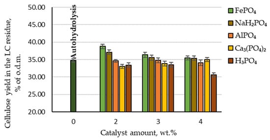 From the point of view of the biorefinery concept, the pretreatment processes’ effects on the amount of cellulose retained in the produced lignocellulosic (LC) residue are also an important indicator. Therefore, the effect of AlPO₄, Ca₃(PO₄)₂, FePO₄, NaH₂PO₄ and H₃PO₄ catalysed hydrolysis, as well as autohydrolysis, on the content of cellulose in LC residue was analysed. The effects of autohydrolysis, H₃PO₄ and phosphorus-containing salts on cellulose degradation during the hydrolysis process are shown in Figure 5.