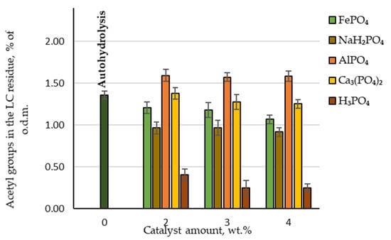 Another important parameter that can affect the effectiveness of biological treatment is the amount of acetyl groups in the obtained LC residue. During biological treatment, acetic acid is formed from these acetyl groups and is considered a critical inhibitor of the enzymatic hydrolysis of cellulose [19]. When analysing the chemical composition of LC residue, the measured amounts of acetic acid produced were recalculated to give the amount of retained acetyl groups. As can be seen in Figure 6, the lowest amount of acetyl groups was found in the LC residue where H3PO4 was used as a catalyst, with less than 0.4% of the oven-dried LC mass. Twice as many acetyl groups were retained in the LC residue if NaH₂PO₄ was used as a catalyst. These results are consistent with those observed when hydrolysate was analysed after furfural extraction.