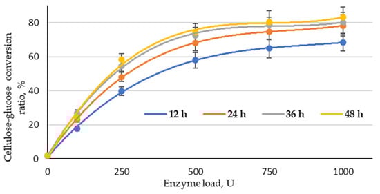 Enzymatic hydrolysis was performed with a fixed load of the enzyme complex (100, 250, 500, 750 and 1000 U) at different reaction times (12, 24, 36 and 48.0 h). As shown in Figure 7, the effect of enzyme load on the effectiveness of the cellulose–glucose conversion ratio was significant in the range 100–500 U at all studied treatment times. When increasing the enzyme load from 500 to 1000 U, the conversion ratio of cellulose into glucose did not increase significantly. This allows for the conclusion that the optimal enzyme load for this type of substrate could be found in the range of 250–750 U. The obtained result also indicates that the treatment time could be reduced to 36 h, because the conversion ratio of cellulose into glucose at 48 h of treatment at all studied enzyme loads was very similar. Based on that, the best conversion ratio of cellulose into glucose (78.8%) can be obtained at 36 h with an enzyme load of 750 U. The highest conversion ratio of cellulose into glucose (83.1%) was obtained at an enzyme load of 1000 and a treatment time of 48 h; the difference in these results is small enough that it is possible to reduce the enzyme load and time, which are crucial parameters from an economic point of view. In addition, the obtained LC residue can be used directly as a substrate for glucose production via enzymatic hydrolysis without rinsing.