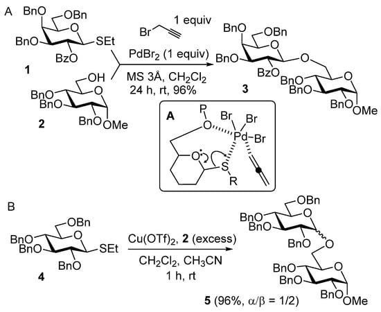 - Escopy, S.; Singh, Y.; Demchenko, A.V. Palladium(II)-assisted activation of thioglycosides. Org. Biomol. Chem. 2021, 19, 2044–2054. [Google Scholar] [CrossRef] [PubMed]