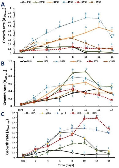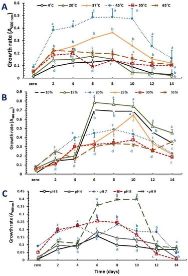 Effect of physical factors on the growth of PHA-producer Halolamina sediminis strain NRS_35. Cells were grown in a PHA-production medium supplemented with glycerol (10 g L−1) as a carbon source; (A) temperature, (B) NaCl concentrations, (C) pH. For each time, different superscript letters indicate significant differences at the p < 0.05 level (one-way ANOVA and Duncan post hoc test) comparing physical factors at different levels.