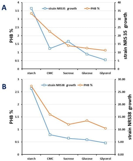 Considering that the availability of carbon and P and the ratio C/N are crucial to optimizing the synthesis of PHA, the effect of various carbon sources on cell growth and PHA biosynthesis in both strains was studied. The results showed that both isolated strains could synthesize PHA from a series of carbon sources including starch, CMC, glucose, glycerol, and sucrose (Figure 4). For Halolamina sediminis NRS_35, starch, CMC, sucrose, glucose, and glycerol yielded PHA contents of 33.4%, 22.5%, 14.0%, 12.5, and 11.2, respectively. Regarding the production of PHA by NRS_38, the current results revealed that PHA contents yielded for starch, CMC, glucose, glycerol, and sucrose were equal to 27.29%, 16%, 12%, 13.5%, and 10.4%, respectively. Thus, starch was the most favorable substrate for PHA accumulation by both strains NRS_35 and NRS_38, reaching a titter of 3.6457 and 2.36 g/L, respectively.