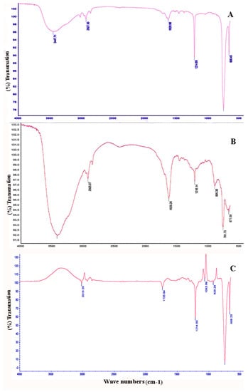 Moreover, the absorption around 1214.89 and 1216.14 cm−1 represents the availability of sulfated functional groups such as C-S-O and S-O [50,54]. The weak band around 895.30 cm−1 is attributed to α-D-glucose [55]. Meanwhile, the sharp bands at 764.31 and 761.73 cm−1 are indicative of glycosidic linkage [56]. On the other hand, the peaks at 668.45 and 671.73 cm−1 are related to the C-H groups of aromatic compounds [57]. The current FTIR patterns reflect the chemical composition of S-layer glycoproteins present in haloarchaea as it is composed of polysaccharides, pseudopeptidoglycan, glycoproteins, or pure protein. On the other hand, the FTIR pattern (Figure 5C) illustrates the recorded peaks for standard PHB.