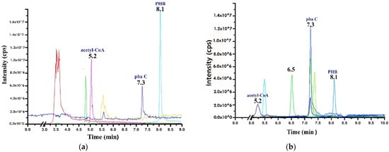 As shown in Figure 6, extracted polymers produced by the NRS_35 strain displayed peaks at different retention times (5.2, 7.3, and 8.1). This peak range indicates the occurrence of PHB and biomolecules involved in its synthesis such as acetoacetyl-CoA (precursor) and the enzyme PHB synthase (PhaC). The detection of PHB in granules produced by NRS_35 and NRS_38 strains using LC-MS/MS is shown in Figure 7a,b, respectively. Regarding the PHB isolated from the NRS_38 strain, peaks are detected at 8.1 min (Figure 7), and at approximately 5.2 and 7.3 min, the last two peaks corresponding to acetyl-CoA and PhaC, respectively, are also observed. Other peaks were observed, which may contain the digested cell debris and other molecules that do not bind to the Accucore C18.
