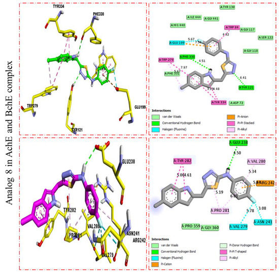 Representation of varied interaction of ligand with enzyme active sites of compound 8 against AchE and BuchE.