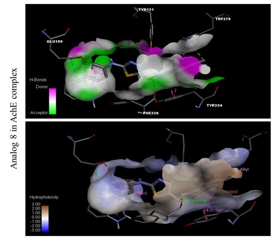 Indication of the hydrogen bond and hydrophobic nature against AChE of compound 8.
