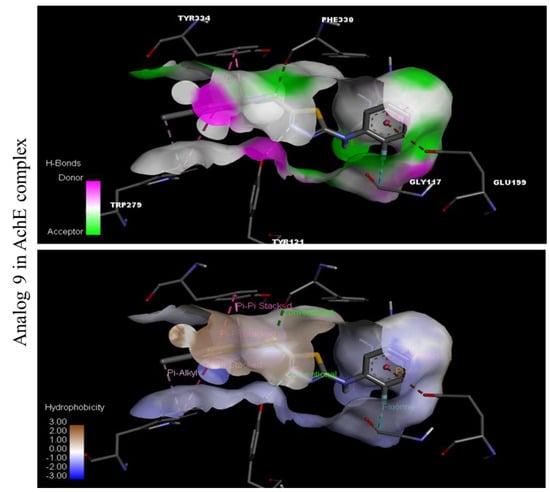 Indication of the hydrogen bond and hydrophobic nature against AChE of compound 9.