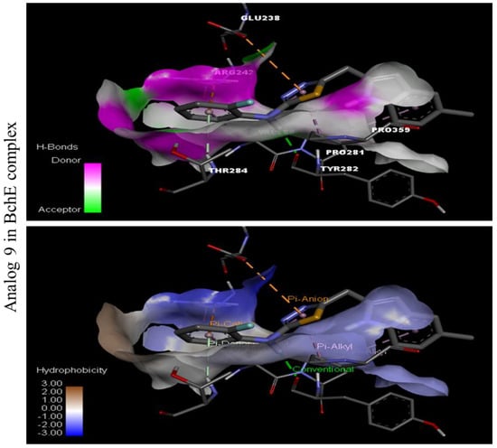 To investigate the mechanism in which synthesized scaffolds attach to the specified enzymes, acetylcholinesterase (AChE) and butyrylcholinesterase (BuChE), molecular docking was carried out. From www.rcsb.org, (28 January 2022) both enzyme crystallographic coordinates were obtained. When tested against the targeted enzymes, the docking strategy shows that the chosen compounds had a wide range of potentials. Among the examined series, several substituted scaffolds interact with various amino acids, but in this case, scaffolds 8 and 9 were found to have great interactions because they both had a flouro-group in the para- or ortho-position of an aromatic ring. Higher hydrogen bond counts result in greater interactions with enzyme active sites. As a result, the flouro-substituted scaffolds 8 and 9 were discovered to have strong interactions, as illustrated in Figure 2, Figure 3, Figure 4, Figure 5, Figure 6 and Figure 7 with a superposed surface complex.