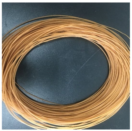 ROA was dried before using. ROA and PLA were first mechanically mixed, then the mixture was pelletized using a twin-screw extruder (SHJ-20, Nanjing Giant Machinery Co. Ltd., Nanjing, China). The PLA/ROA composite filaments with a diameter of 1.75 ± 0.05 mm (Figure 1) were finally prepared using a twin-screw extruder (KS-HXY, Kunshan HUANXINYANG Electrical Equipment Co. Ltd., Suzhou, China) at the temperature of 170 °C to 190 °C from hopper to die.