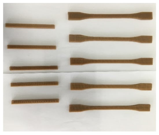 A MOSHU S108 desktop-level 3D printer from Hangzhou Shining 3D Technology Co. Ltd. (Hangzhou, China) was used and equipped with a 0.4 mm nozzle. The sample model file (STL file) for the test was computer-aided designed and was then sliced and transformed into G-code. The printing parameters were set using the same software. Using PLA/ROA composite filament as the printing material, the samples (Figure 2) were then FDM 3D printed. For comparison, the printing parameters concerned included the printing temperatures of 200, 210, and 220 °C, the printing speeds of 50, 60, and 70 mm/s, the filling densities of 60, 80, and 100%, the printing layer thicknesses of 0.1 and 0.2 mm, and the deposition angles of 0, 45, and 90°.