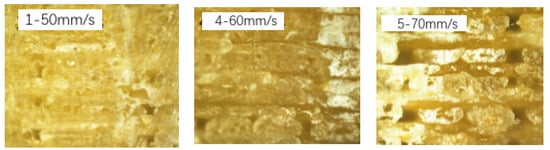 The results of samples No. 1, 4, and 5 in Table 1 demonstrated the influences of the printing speed on the mechanical properties of the 3D-printed PLA/ROA composites. The fractural morphologies of PLA/ROA composites obtained at different printing speeds observed by optical microscope were shown in Figure 4. The tensile strength, tensile modulus, flexural strength, and flexural modulus of the sample with a printing speed of 50 mm/s (sample No. 1) were found to be 17.46 MPa, 234.27 MPa, 97.60 MPa, and 16,406.04 MPa respectively, however, those were 14.36 MPa, 162.21 MPa, 62.22 MPa, and 13,545.13 MPa for the sample with a printing speed of 60 mm/s (sample No. 4), and 13.25 MPa, 154.62 MPa, 60.43 MPa, and 10,820.75 MPa for the sample with a printing speed of 70 mm/s (sample No. 5). Overall, these mechanical properties of the composites decreased as the printing speed increased. This was due to the poorer precision and uneven bonding between the upper and lower layers with the increased printing speed as shown in Figure 4, inducing the weakened interfacial adhesion between different printing layers, and even the occurrence of the cavities and delamination at the interface between different layers. The reduction in mechanical properties of 3D-printed samples with the increased printing speed was also reported by Zhu et al. [19].