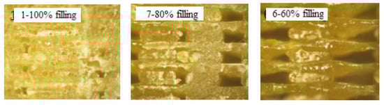 Figure 5 showed the optical microscopy images of the specimen cross section at different filling densities. Obviously, filling density had a great relationship with the compactness of filling in the shell of 3D printing parts, which is well in accordance with the result reported in the literature [19]. With the increase of the filling density, the internal structure of the printed sample became more compact, and fewer internal defects existed; the mechanical properties of the sample would thus be accordingly improved. The decrease in mechanical properties of FDM 3D printed specimens with the reduction of filling density may be due to the poorer adhesion between neighboring layers because of the lack of bonding points induced by lower filling density.