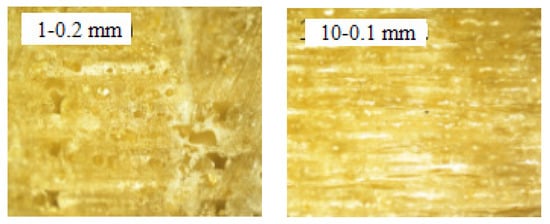 Rebenaque et al. found that, when increasing the filling density, the maximum strength to bending of FDM 3D-printed PLA specimens increases considerably [20] The similar conclusions can be drawn in this study. For FDM 3D printed PLA/ROA composite specimen, as was shown in Table 1, the tensile strength, tensile modulus, flexural strength and flexural modulus of the sample with a filling density of 100% (sample No. 1) were 17.46 MPa, 234.27 MPa, 97.60 MPa, and 16,406.64 MPa, while those of the sample with a density of 80% (sample No. 7) were 16.53 MPa, 215.26 MPa, 94.31 MPa, and 15,878.05 MPa, which were 5.33%, 8.11%, 3.37%, and 3.22% smaller than those of sample No. 1, respectively. For the sample with a filling density of 60% (sample No. 6), its strengths and moduli were decreased furthermore, in this situation, its tensile strength, tensile modulus, flexural strength, and flexural modulus were only 84.76%, 88.24%, 89.38%, and 87.61% those of sample No. 1, respectively.
