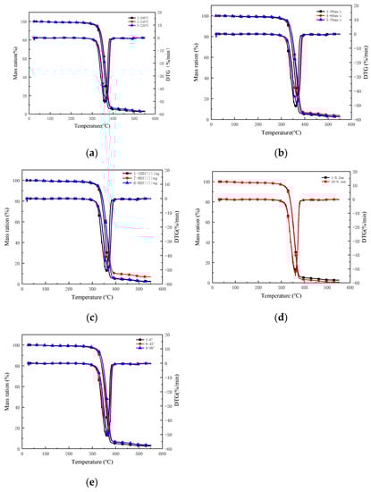 Thermal stability of FDM-3D printed PLA/ROA composite specimen was studied by thermo-gravimetric analysis. Figure 10a–e showed the weight loss over time curves and their corresponding derivatives of the specimens at different printing conditions. It can be found that each sample had a mass loss of around 5% at around 100 °C, which was due to the evaporation of moisture and the release of the small molecular substances in the sample. The major decomposition for each specimen all happened between 330 °C and 410 °C.