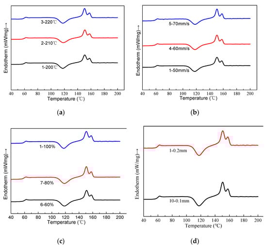 Figure 11 showed the melting and crystallization transition curves of the printed PLA/ROA composite specimens. The results derived from Figure 11 were listed in Table 3. It was found that the melting endotherm of each sample displayed two melting peaks at around 151 and 158 °C. The double-melting behavior was probably linked to the formation of different crystal structures, and the lower one corresponded to the melting of crystals with an imperfect structure. Similar phenomena were also described by Hao Liu et al. [11] and Guim et al. [21]. Endotherms in Figure 11 indicated that PLA/ROA composite specimens had well-defined glassy transition peaks centered at around 62.5 °C. The difference of the glassy transition temperature (Tg) among the printed specimens obtained at various printing parameters was actually very tiny (Table 3). In addition, a big cold crystallization peak appeared during the second heating process. This crystallization behavior was attributed to too slow crystallization rate of pure PLA to well organize its molecular chains timely [11].
