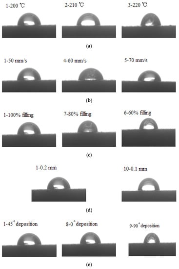 The shapes of water droplets on the surfaces of the printed specimens were shown in Figure 12a–e. The measured averaged contact angles were summarized in Table 4. The results showed that the contact angle values of the specimens increased slightly with the increase of the printing temperature or the filling density, while they decreased with the increase of the printing speed, the deposition angle, or the printing thickness. Among all the printing parameters, the printing speed had the greatest effects on the contact angle values, the specimen printed at a speed of 70 mm/s (sample No. 5) had the smallest contact angle of 70.5°, which was 3.2° and 7.7° lower than those on the specimens printed at a speed of 60 mm/s (sample No. 4) and 50 mm/s (sample No. 1), respectively. The decrease in the contact angle value was very obvious, which meant that the wettability of the specimens decreased with the increasing printing speed significantly. Though the other parameters all had effects on the wettability of the specimens, the differences in the contact angle values among these specimens did not differ from one another greatly; that is to say, the printing parameters except for the printing speed had tiny effects on the wettability of the printed specimens.