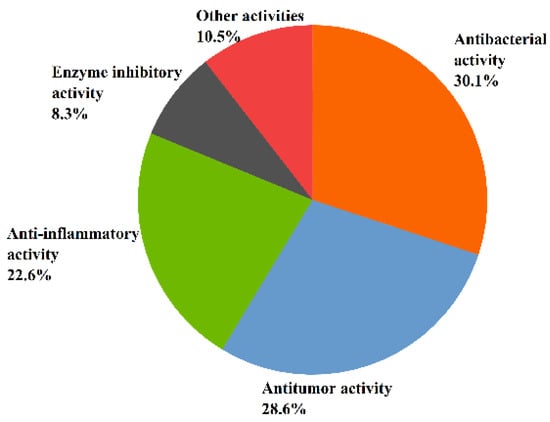 | Compounds 115–118 | Marine-ascidian-derived fungus Aspergillus ustus TK-5 | inhibitory activity against neuraminidase | 28.4–37.3 µM | [55] 2018 |