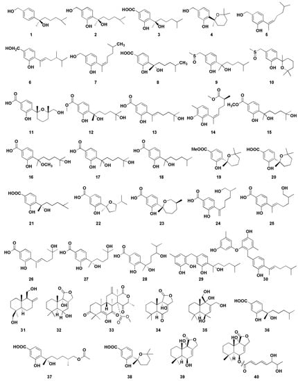 - Liu, S.; Dai, H.; Konuklugil, B.; Orfali, R.S.; Lin, W.H.; Kalscheuer, R.; Liu, Z.; Proksch, P. Phenolic bisabolanes from the sponge-derived fungus Aspergillus sp. Phytochem Lett. 2016, 18, 187–191. [Google Scholar] [CrossRef]