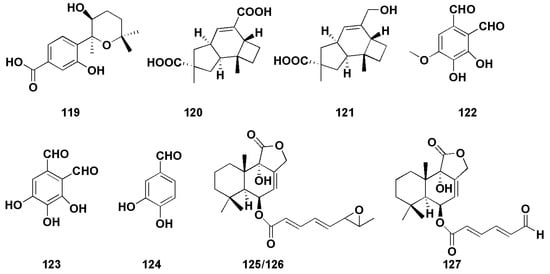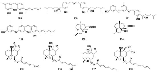 | Albican-11,14-diol (31) | Marine-alga-derived fungus Aspergillus versicolor | E. coli and S. aureus | Inhibition zones were 7–10.3 mm at 30 μg/disk | [23] 2012 |