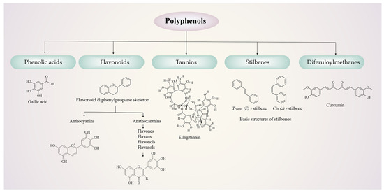Polyphenols are dietary antioxidants commonly found in plants and secondary metabolites of plants. They mainly exist in fruits, vegetables, nuts, soybeans, tea, cocoa, and wine. Chemically, polyphenols are characterized by aromatic rings with multiple hydroxyl groups. So far, 8000 identified compounds have been isolated in the scientific community [23]. Due to their complex structures, it is challenging to accurately classify and differentiate these compounds. According to the number of phenolic rings contained in polyphenolic compounds and the structural elements combined with these rings, they can be roughly divided into several categories: phenolic acids, flavonoids, tannins, stilbenes, and diferuloylmethanes [16,24]. The chemical structures are shown in Figure 1.