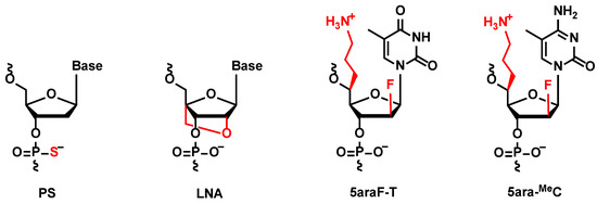 Chemical structure of phosphorothioate (PS), locked nucleic acid (LNA), (S)-5ʹ-C-aminopropyl-2ʹ-arabinofluoro-thymidine (5ara-T), and (S)-5ʹ-C-aminopropyl-2ʹ-arabinofluoro-5-methyl-cytidine (5ara-MeC).