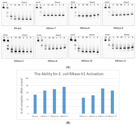 Before the in vitro cell experiments, we established a simple enzymatic reaction system using RNase H1 purified from E. coli to determine whether RNase H-mediated cleavage could be activated by KN5ara gapmers [33,34]. The KN5ara gapmers used in this experiment were mixed with fluorescein-labeled cRNA-2 at 1:5 before annealing. These duplexes were dissolved in a buffer containing 50 mM Tris–HCl (pH 8.0), 75 mM KCl, 3 mM MgCl2, and 10 mM dithiothreitol. Diluted E. coli RNase H1 solution (60 unit/L in H2O) was then added, and the mixture was incubated at 37 °C for the required time (0, 1, 5, 15, and 30 min and 1, 2, and 4 h). The aliquots were analyzed using 20% denaturing PAGE and then quantified using a luminescent image analyzer LAS-4000 (Fujifilm). As shown in Figure 2, even though the initial reaction velocity showed a slight change, it was confirmed that the complete cRNA strand was almost cleaved in KN5ara gapmers as well as in the positive control KN-pos after a 5 min reaction. Despite differences in each cleavage pattern, a single 5ara modification moderately affected the cleavage mechanism of E. coli RNase H1, which was consistent with previous reports, because of the remaining recognition portions [27].