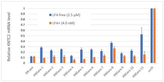 In addition to the physical experiments and simple in vitro enzymatic assays, in vitro cellular experiments were performed to knock down KNTC2 in A549tGFP cells to evaluate the antisense activity of each KN5ara gapmer. The pre-cultured A549tGFP cells were treated with KN5ara gapmers at a final concentration of 4.0 nM or 2.5 µM, and were transfected with 0.3% Lipofectamine® 2000 (LFA) or not, respectively. After incubation, total mRNA inside the cells was extracted, followed by reverse transcription of the targeted KNTC2 mRNA. A quantitative real-time polymerase chain reaction (qRT-PCR) was performed in duplicate, and relative KNTC2 mRNA levels were calculated, as shown in Figure 4.