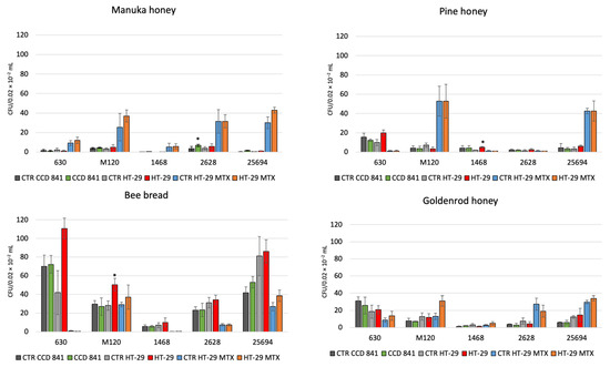 The 24-well plates of the 15-day culture of HT-29, HT-29 MTX, and CCD 841 CoN cell lines were washed twice with PBS buffer. After rinsing, the wells were supplemented with 400 μL of DMEM culture fluid with 1% content of individual tested bee products and incubated for 4 h at 37 °C with a flow of 5% CO2. Then, 100 μL of the suspension of the tested bacteria was added to the wells and incubated for another hour. The inoculum consisted of bacterial suspensions with a density of 3.0 on the McFarland scale prepared from 24 h bacterial cultures on a solid medium. The blank was the inoculum cell culture without the addition of bee products. After 1 h, the medium was harvested and washed twice with PBS buffer, then the cells were trypsinized for 10 min at 37 °C. The trypsin effect was stopped by adding 500 µL of medium with 10% FBS. The content of each well in the amount of 100 μL was transferred to sterile Eppendorf tubes containing 900 μL of sterile water, and 20 μL was spread on a solid medium with 5% sheep blood and incubated for 48 h at 37 °C under anaerobic conditions. The colonies were counted and averaged [27].