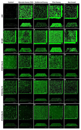 The effect of Manuka honey 550+, goldenrod honey, pine honey, and bee bread on biofilm formation by reference C. difficile strains 630 and M 120, and clinical strains RT027 (No 4), RT023 (No 7), and RT176 (No 9). Representative confocal microscopy images of horizontal (xy) and vertical (xz) projections of C. difficile biofilm structures. Slices view with maximum intensity projection. Legend: Control-630 (1), M 120 (6), RT027 (11), RT023 (16), RT176 (21); Manuka honey 550+ 630 (2), M 120 (7), RT027 (12), RT023 (17), RT176 (22); Goldenrod honey-630 (3), M 120 (8), RT027 (13), RT023 (18), RT176 (23); Pine honey-630 (4), M 120 (9), RT027 (14), RT023 (19), RT176 (24); Bee bread-630 (5), M 120 (10), RT027 (15), RT023 (20), RT176 (25).