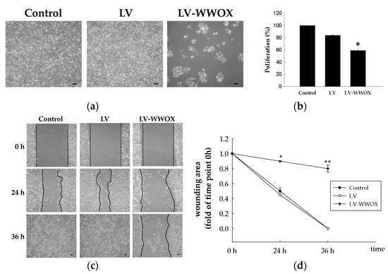 Furthermore, a wound-healing assay was performed to assess the effect of WWOX on bladder cancer cell migration (Figure 2c). LV-WWOX significantly decreased the extent of wound healing (percentage of wound closure) in the AY-27 cell line (* p < 0.05). These results indicated that LV-WWOX inhibited the cell growth and metastasis of the bladder cancer cells. The wound-healing progress in the control and LV group cultures was rapid, such that the scratch had disappeared in 36 h, while in the treated samples, WWOX inhibited the healing process and the closure of the denuded area progressed more slowly (Figure 2d).