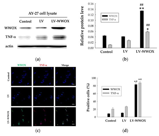 To determine if WWOX expression may affect the modulation of TNF-α, we performed Western blotting and immunofluorescent staining to determine the changes in TNF-α protein expression (Figure 3). The expression of TNF-α in those AY-27 cells subjected to LV-WWOX treatment was assessed using Western blot analysis (Figure 3a). As shown in Figure 3b, the TNF-α protein expression levels in those AY-27 cells infected with LV-WWOX were 2.17-fold (p < 0.001) higher than those in the LV. Those AY-27 cells infected with LV-WWOX were 5.07-fold (p < 0.01) higher than the control. The WWOX protein expression levels in those AY-27 cells infected with LV-WWOX were 3.25-fold (p < 0.001) higher than those in the LV. Those AY-27 cells infected with LV-WWOX were 3.03-fold (p < 0.01) higher than the control.