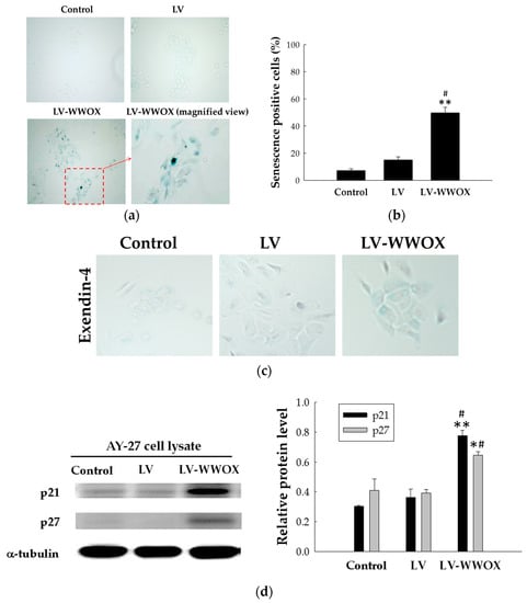 WWOX induced premature senescence in AY-27 cells. (a) SA-β-gal staining increased with LV-WWOX treatment in the AY-27 cells. (b) The percentage of SA-β-gal-positive senescent cells in the LV-WWOX-treated, LV, and control AY-27 cells is presented as the mean ± SD. ** p < 0.01 compared to the control groups; # p < 0.05 compared to the LV groups. (c) SA-β-gal staining of exendin-4-treated AY-27 (control), AY-27-LV, and AY-27-LV-WWOX cells. (d) The expression of p21 and p27 in the LV-WWOX-treated, LV, and control AY-27 cells was detected by Western blot. α-Tubulin served as a loading control. Each bar represents the mean ± standard deviation (SD) from three independent experiments. The results are expressed as the mean ± SD. * p < 0.05 and ** p < 0.01 compared to the control groups; # p < 0.05 compared to the LV groups.