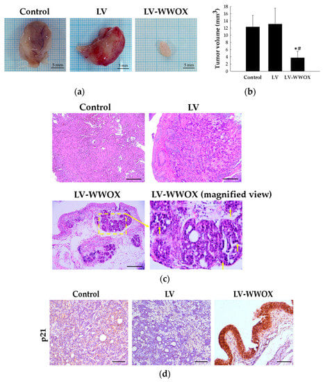 Inhibitory effects of WWOX in the F344/AY-27 rat model. (a) Excised tumor photographs. (b) Tumor volume (tumor volume = (longer diameter × shorter diameter2)/2) was analyzed. The results are expressed as the mean ± SD. * p < 0.05 compared to the control groups; # p < 0.05 compared to the LV groups. (c) Histopathologic findings with H&E staining. (d) Images of the tumor p21waf protein expression presented by immunohistochemistry (scale bar = 100 μm). Original magnification was 400×.