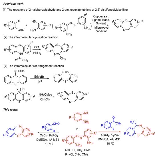 Due to its wide applications, it is meaningful to find some simple, efficient and practical methods for the synthesis of dibenzothiazepines. In past studies, several typical methods have been developed, including the reactions of 2-halobenzaldehyde and 2-aminobenzenethiols or 2,2′-disulfanediyldianiline [10,11,12,13,14], the intramolecular cyclization reactions [9,15], the intramolecular rearrangement reactions [16], and some other methods (Scheme 1) [17]. The previous reports have mainly focused on the classic coupling reactions of 2-halogenated benzaldehyde with 2-aminobenzenethiols or 2,2′-disulfanediyldianiline because it is direct and effective. However, the classic copper-catalyzed coupling reactions for the synthesis of dibenzothiazepine are complicated, often required the copper salt, ligand, base and solvent and the substrate application scopes were limited [18]. For example, in 2009, Reiko Yanada et al. employed a Pd(OAc)2-catalyzed one-pot reaction to synthesize dibenzo[b,f][1,4]thiazepines by microwave-accelerated tandem process of 2-brmobenzaldehyde and 2-aminobenzenethiols [19]. In 2015, Yie-jia Cherng et al. also reported the microwave-assisted strategy to assemble dibenzo[b,f][1,4]thiazepines [10]. In the same year, Anuj Sharma et al. utilized a standard base-catalyzed condensation of amines with aldehydes to afford dibenzo[b,f][1,4] thiazepines [11]. Recently, Yun Luo and Jiaxi Xu et al. synthesized these heterocyclic molecules using K2CO3 and ethane-1,2-diol. [20] Copper-catalyzed coupling reactions is a powerful tool for the construction of C–X (X = S, N, O, etc.) bonds and can be applied in the efficient synthesis of heterocyclic compounds in organic synthesis [21,22,23,24,25,26,27]. Simplifying the copper-catalyzed reaction conditions is also an irreplaceable advantage for the application of the reaction. Our group has been working on the copper-catalyzed coupling reactions to synthesize heterocyclic compounds, in continuation of our works to modify the copper-catalyzed cross-coupling reactions [28,29]. Here, we reported an “One-pot” CuCl2-catalyzed C–S bond coupling reactions for the synthesis of dibenzo[b,f][1,4]thiazepines and 11-methyldibenzo[b,f][1,4]thiazepines via 2-iodobenzaldehydes/2-iodoacetophenones with 2-aminobenzenethiols/2,2′-disulfanediyldianilines by using bi-functional-reagent DMEDA. Compared to the previous reports of synthesizing dibenzothiazepines in entry 1, our research used DMEDA in small quantities as a bifunctional reagent, which worked as ligand and reductant; the substrate scope is wide (the reaction substrates 2-iodobenzaldehydes/2-iodoacetophenones and 2-aminobenzenethiols/2,2′-disulfanediyldianilines could cross-react with each other) and the reaction conditions were simplified, making the reaction conditions more suitable for large-scale production.