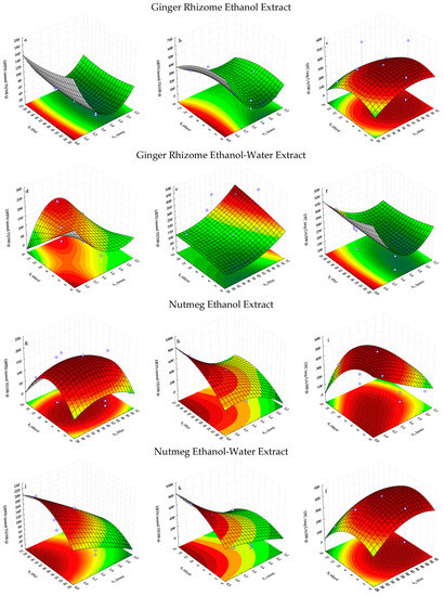 The PCM model adequacy was tested using the lack-of-fit Fisher’s test (F-test), which was insignificant for p > 0.05 (Table 4). The ANOVA results of DPPH, ABTS, and TPC for the ginger rhizome and nutmeg ethanol and ethanol-water extracts revealed an insignificant lack of fit (F values = 0.044–18.3, p > 0.05). Therefore, these models were adequate for prediction within the range of variables employed. In addition, high F-values (53.7–361.1 for the DPPH and ABTS of both extracts and TPC in the ethanol extract of ginger rhizome, as well as 68.5–218.9 for the ABTS of the ethanol and ethanol-water extracts and TPC in the ethanol-water extract of nutmeg) demonstrated that the empirical models were significant with low probability values (p < 0.05). This suggests that the proposed mathematical models are valid and convenient for predicting the antioxidant properties of ginger rhizome (except TPC in ethanol-water extract) and nutmeg (except DPPH for both studied extracts and TPC in ethanol extract) as determined by the DPPH, ABTS, and F–C methods under any combinations of variables (the preparation conditions of spices for extraction process). Obviously, the low F-values (16.1 and 18.3 for TPC in the ethanol extract of nutmeg and the ethanol-water extract of ginger rhizome, respectively, as well as 26.2 and 26.9 for the DPPH of both extracts of nutmeg) and p-values > 0.05 suggest that the models’ predictions of the total amounts of polyphenols and antioxidants able to quench the DPPH radical in the prepared extracts of nutmeg were insignificant.